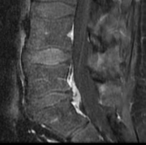 31 year old man presents with excruciating right leg pain. MRI shows a right L5-S1 disc herniation on the right (see arrow). The left image is a sagittal view where you are seeing the spine from the side. The right image is looking at a cross section of your spine. On this view the right side is the left of the image and vice versa.